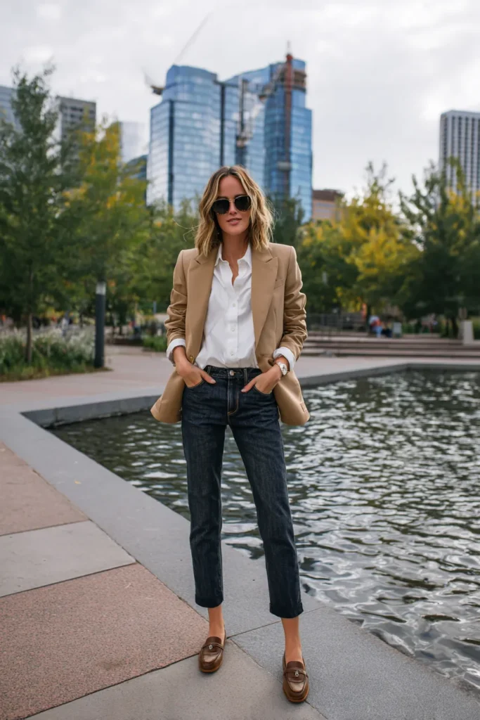 This outfit pairs a crisp white button up shirt with a tailored camel blazer that instantly adds structure and warmth. The dark straight leg jeans keep things relaxed while still looking refined, and the brown loafers give the whole look an easy polished finish. The sunglasses and simple accessories tie in that effortless city vibe that feels chic without trying too hard.