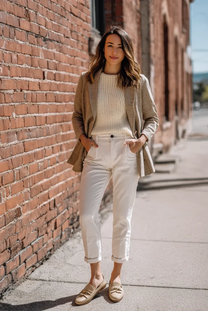 This outfit mixes soft textures and warm neutrals in the prettiest way. The light beige blazer adds an easy tailored layer while the chunky cream knit sweater underneath keeps things cozy and relaxed. The crisp white pants brighten the whole look and create a clean fresh base. Paired with simple beige loafers the outfit feels effortless polished and perfect for those workdays that still have a bit of chill in the air.