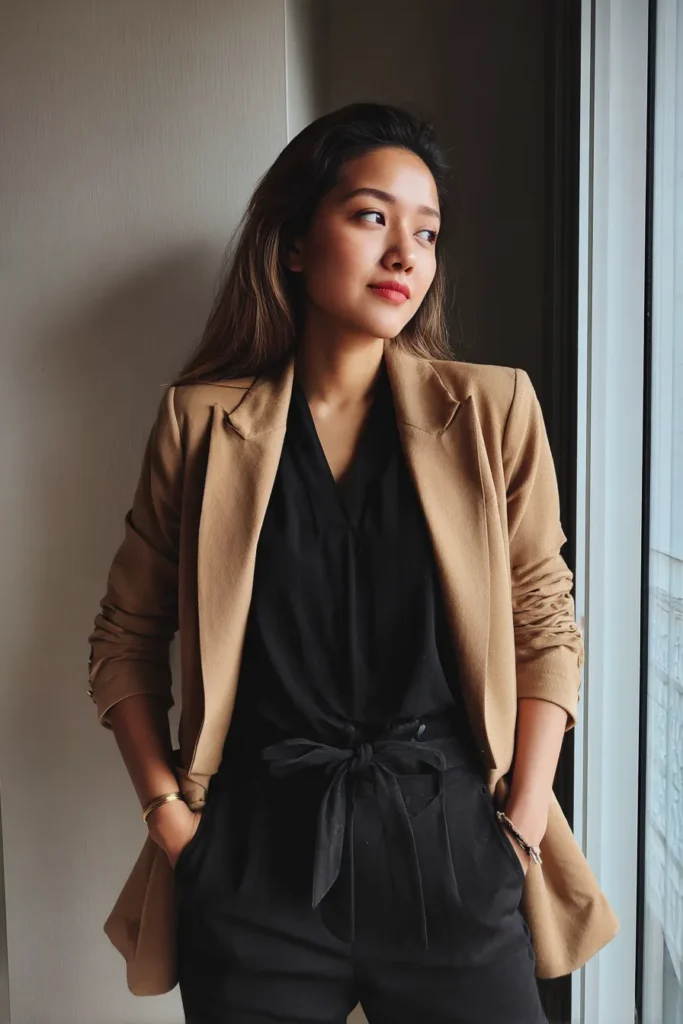 This outfit pairs a warm camel blazer with an all black top and tapered black trousers for a look that feels sharp clean and incredibly chic. The blazer brings a soft structured layer that brightens the outfit while the black blouse keeps things sleek. The tie waist trousers add a touch of femininity and the rolled sleeves on the blazer give everything a relaxed effortless feel. The gold bracelets add a hint of shine without taking away from the simplicity of the look.