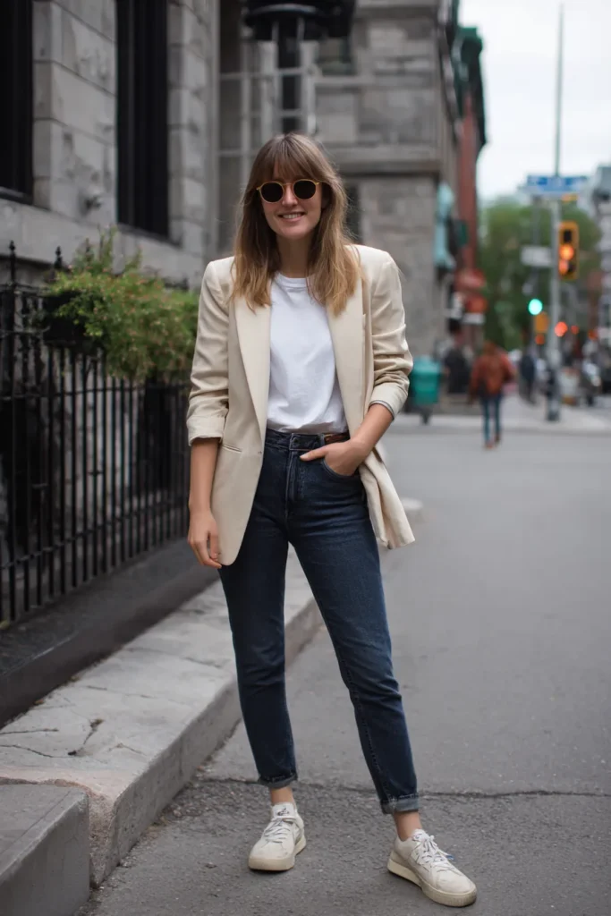 This outfit blends easy basics with a polished layer in the best way. The cream blazer adds a clean structured touch while the classic white tee underneath keeps things relaxed and simple. The dark wash jeans create a flattering contrast and give the outfit a little bit of edge. Paired with white sneakers and round sunglasses the whole look feels modern casual and perfect for a laid back workday or a busy day in the city.