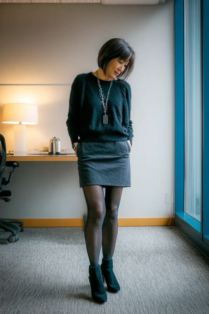 I love how this look mixes comfort with a polished feel. The mini skirt adds a playful edge without sacrificing office readiness and the darker palette makes everything feel chic and intentional. The tights and boots keep the proportions balanced which is always something I appreciate when I want to look put together without trying too hard. This is the kind of outfit that makes me feel quietly confident and ready for anything the day brings.