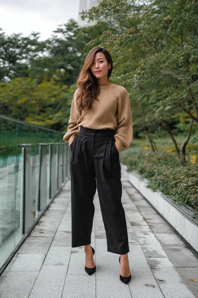 I am obsessed with this pairing because it hits that perfect balance between comfort and corporate chic. The slouchy, inviting texture of the lighter-colored knit works so beautifully against the darker, more structured fabric of the trousers. The key to making the outfit feel sophisticated, not sloppy, is the contrast in silhouettes; the volume on top and the high-waisted, slightly tapered pants create a super flattering shape. It’s definitely an outfit I’d wear when I want to feel like I’m in my pajamas but still look like the most stylish person in the room.