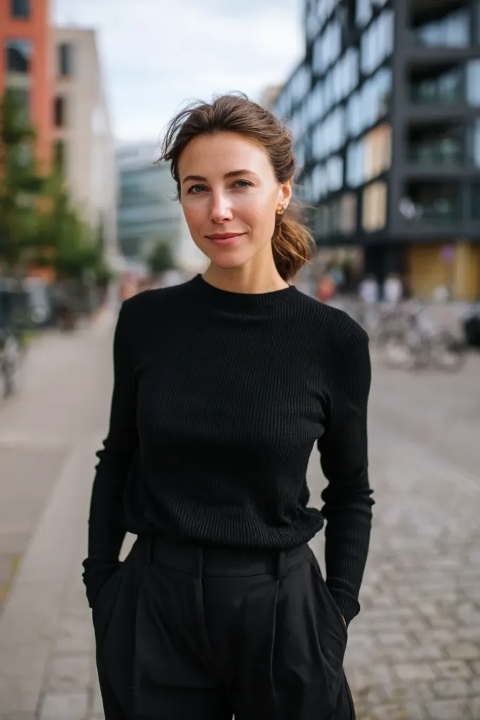I honestly believe that an all-black outfit is one of the easiest ways to look immediately elegant, and this one proves it by playing with texture and fit. The contrast between the smooth, fitted knit on top and the structured, voluminous tailoring of the trousers is so flattering and contemporary. Sticking to a single dark color creates a wonderful, uninterrupted line that makes you look taller and more streamlined, which is a massive bonus. This is definitely the look I reach for when I want to feel confident, serious, and like I have my life totally together, even when I’m running on coffee alone.