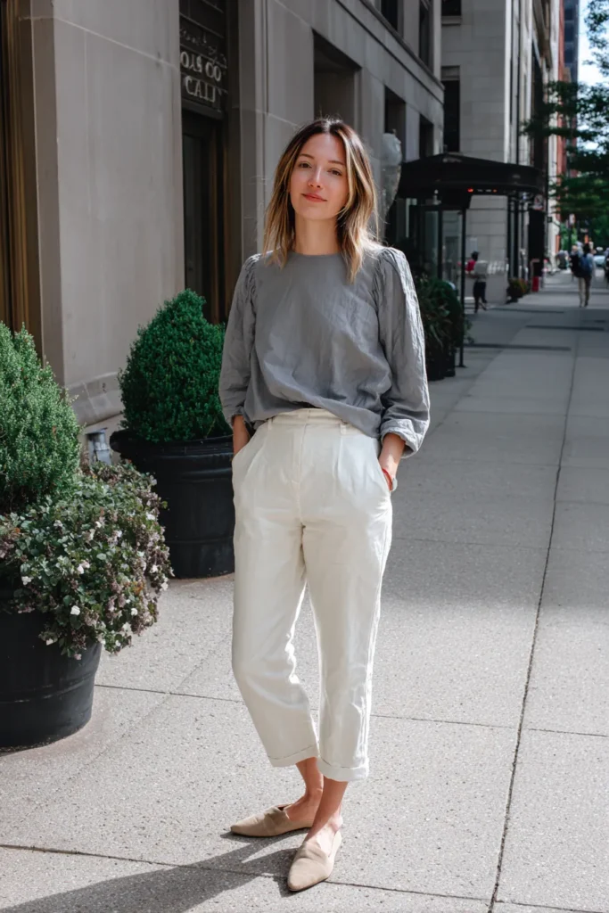 I love this ensemble because the color combination of the cool grey and the bright white is just so refreshing and instantly sophisticated. The contrast in volume is another style trick that makes this work so well, balancing the slightly billowy top with the structured yet relaxed trousers. Wearing those nude, pointed-toe flats is genius because they keep the look sleek and automatically elongate the leg line where the cuffed pants hit. It’s definitely the perfect outfit for those days when you need to look polished but still want to feel as comfortable as possible, a true summer workwear dream.