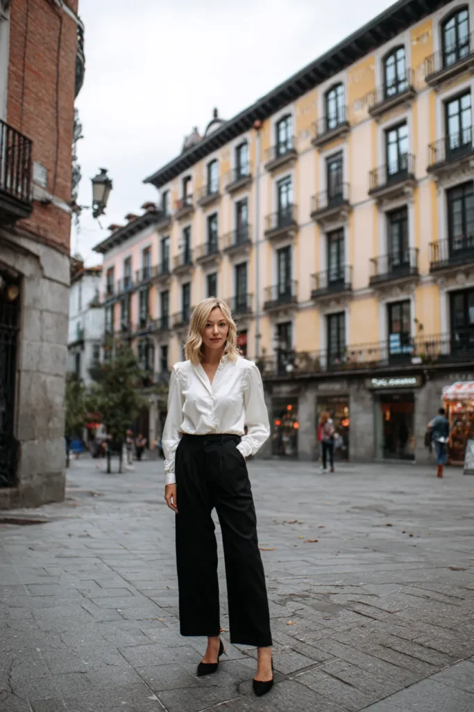 This elegant look is a testament to the power of a simple color palette elevated by beautiful, thoughtful details. The outfit starts with a pair of perfectly tailored, high-waisted black wide-leg trousers that bring a chic, powerful silhouette. On top, she’s wearing a crisp white button-down blouse that has charming, subtle feminine touches, like a ruffled collar or delicate shoulder detail. A classic pair of black pointed-toe block or low-stiletto heels completes this sophisticated workwear staple.