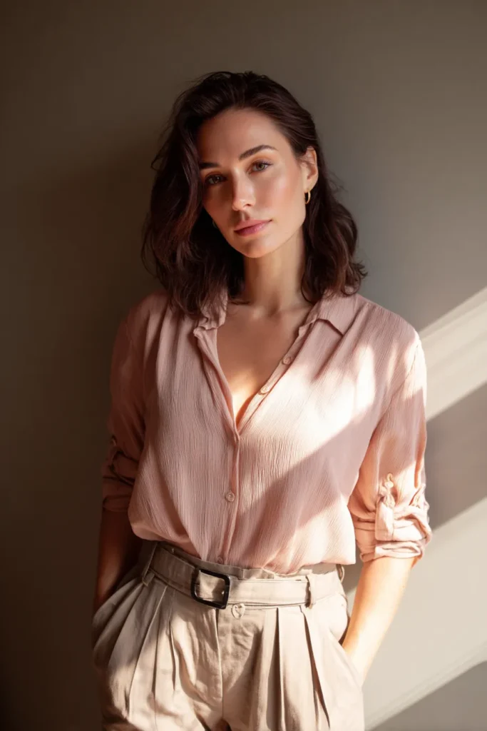 I’m completely obsessed with this combination of colors because the blush and taupe pairing is so unexpectedly sophisticated and incredibly flattering on a variety of skin tones. The softness and drape of the silky blouse make the outfit feel romantic, which is a lovely counterpoint to the sharp tailoring of the pleated trousers. Emphasizing the waist with the high rise and the tucked-in shirt is key to making this outfit feel polished and creating a desirable silhouette. This is definitely my suggestion for anyone who wants to bring a touch of feminine charm to their everyday business attire.