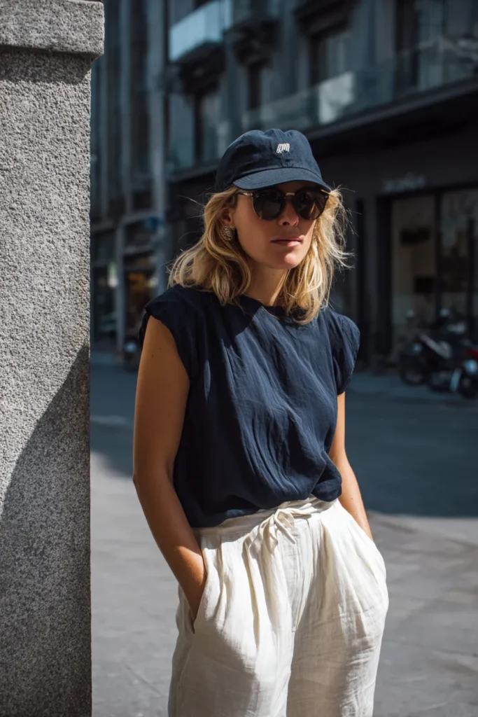 This outfit brings together a relaxed navy cap sleeve blouse with breezy cream linen trousers that feel made for warm weather. The top has a soft drape that keeps the look polished while still feeling effortless and the light linen pants add that airy movement that makes hot days so much easier. The tie waist gives the trousers a subtle shape and the creamy shade keeps the whole outfit feeling bright. The dark cap and sunglasses add a casual modern twist which makes the look perfect for a warm business casual day in the city.