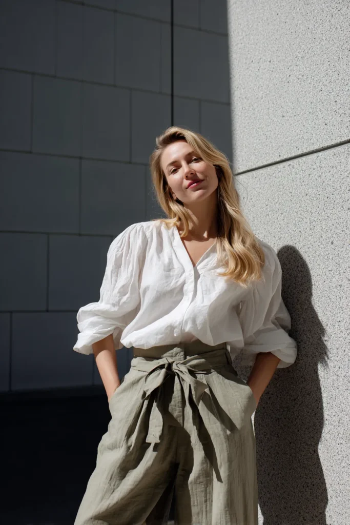 This outfit pairs a dreamy white peasant style blouse with soft sage linen pants that tie at the waist for an easy flattering shape. The blouse has a light airy feel with gentle volume in the sleeves that makes it perfect for warm sunny days and the linen pants add that relaxed texture that always looks chic in the heat. The soft neutral palette feels fresh and calm which gives the whole look a polished easygoing vibe that works beautifully for warm business casual settings.
