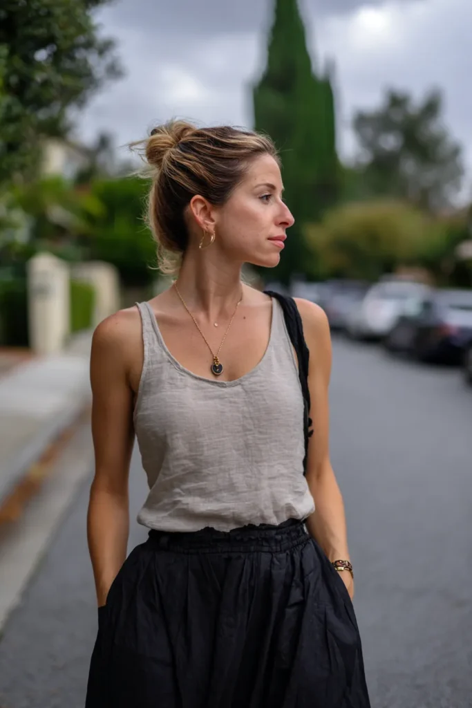 This outfit pairs a soft taupe linen tank with flowy black paperbag waist trousers that bring an effortless balance of comfort and polish. The tank has that natural airy texture that feels perfect on hot days and the trousers add subtle volume with their gathered waistband and relaxed drape. The muted colors keep everything clean and minimal while the gold earrings and simple necklace add a touch of shine. The whole look feels unfussy modern and quietly chic in the best way.