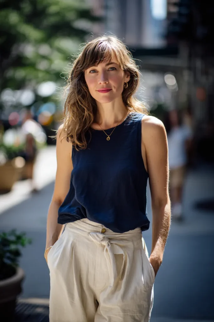 I love how breathable and easy this outfit feels while still looking put together. The linen tank keeps me cool without ever clinging and the paperbag waist trousers give me such a flattering shape without feeling restrictive. The color combo is simple but always stylish which makes getting dressed so much easier on warm busy mornings. It is the kind of outfit I reach for when I want to stay comfortable all day yet still feel confident and polished.