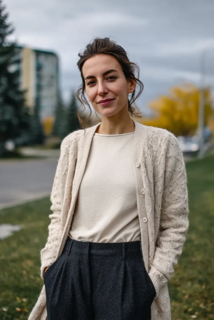This outfit pairs a cozy cream knit cardigan with a simple light beige top that keeps everything soft and polished. The cardigan has a textured pattern that adds warmth and personality without feeling bulky. The top sits neatly underneath and creates a clean monochromatic look through the upper half. Dark tailored trousers balance the soft tones and give the outfit a structured finish that feels interview ready. The overall vibe is calm and approachable with just the right amount of polish.