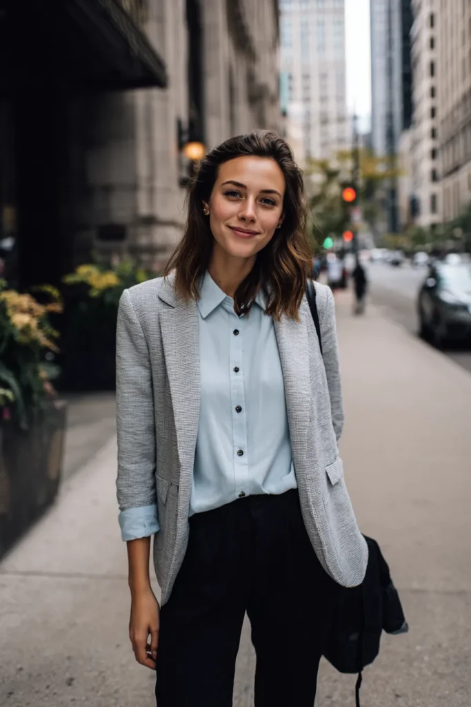 This look pairs a light grey textured blazer with a soft blue button up that has a clean and polished feel. The sleeves are casually rolled, giving the outfit a relaxed touch without losing its smart finish. She wears loose black trousers that drape nicely and keep the silhouette comfortable yet refined. The colors stay soft and neutral which makes everything look calm and put together. The whole vibe feels modern and approachable with a hint of quiet confidence.