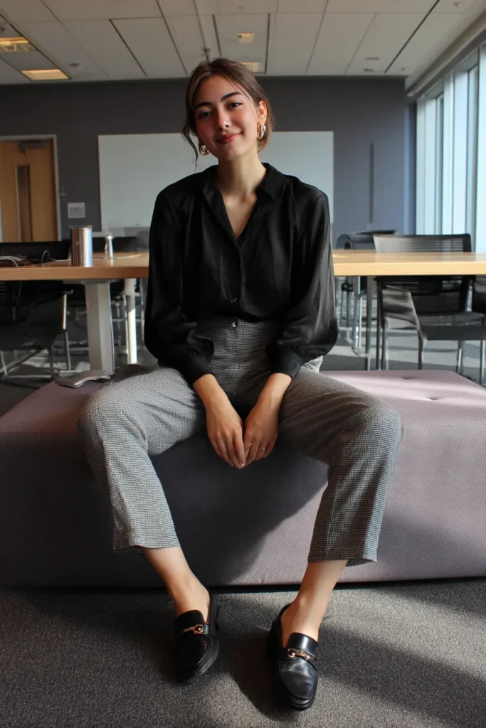I love how effortlessly refined this pairing feels. The blouse has that slightly undone charm that keeps the look from feeling too stiff and the checked trousers make everything look thoughtful and sharp. The loafers are the kind of shoe I reach for when I want comfort but still want to look like I have it all together. This is the kind of interview outfit that helps me feel capable without trying to impress too hard. It lets my personality show while still keeping things polished and professional.