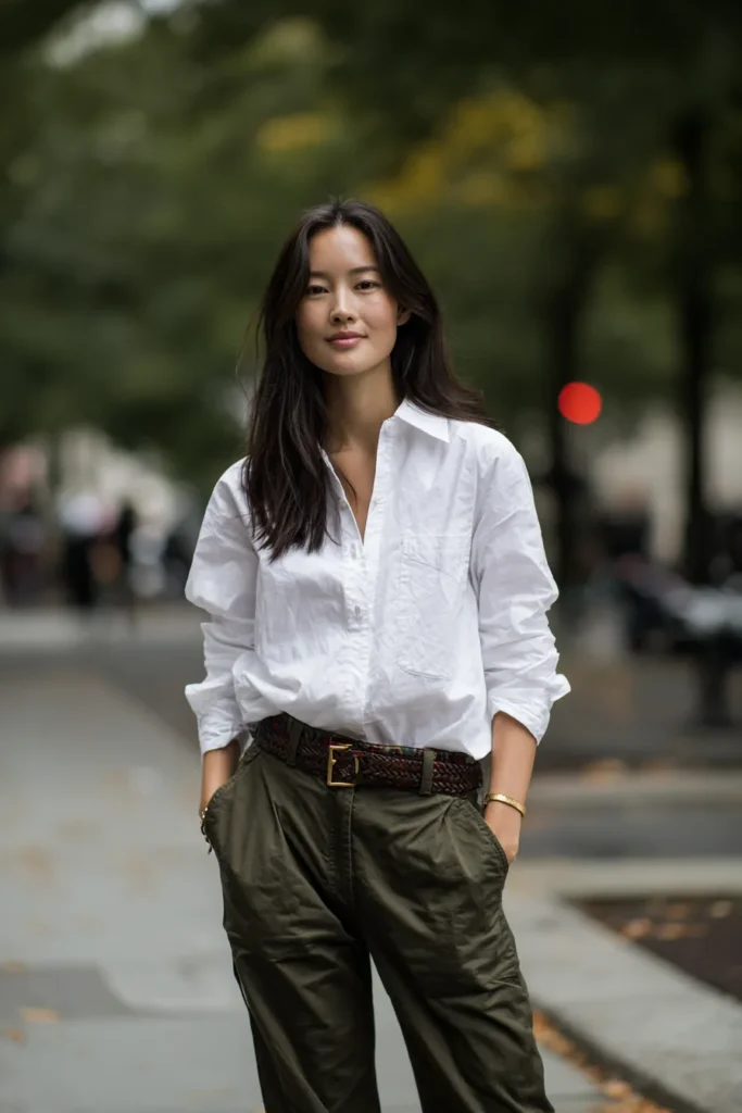 I love how this look gives me that effortless confidence that comes from mixing something crisp with something relaxed. The white shirt keeps everything sharp while the olive trousers make the outfit feel grounded and modern. The belt pulls the whole look together in such a simple way and it adds just enough detail to feel intentional. This is the kind of outfit I reach for when I want to look capable without feeling overdressed. It lets me breathe while still giving first impression energy in the best way.