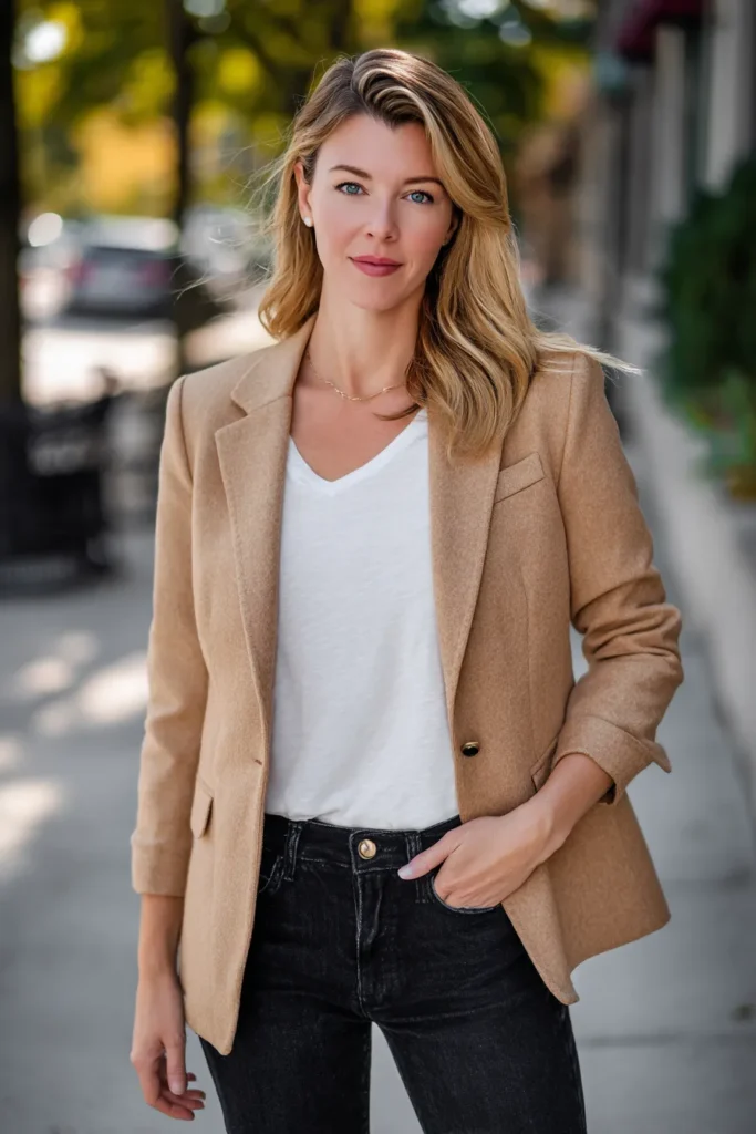 This outfit pairs a tailored camel blazer with a simple white V neck tee that keeps everything looking clean and relaxed. The blazer has a soft structured feel with rolled sleeves that make it look modern and easy. Dark denim adds a sleek contrast and gives the whole look a grounded polished vibe without feeling too formal. The warm camel tone against the crisp white tee creates a classic mix that always looks fresh.