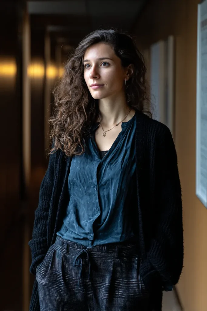 This outfit blends a textured black cardigan with a deep teal blouse that has a soft sheen and a relaxed drape. The blouse adds a hint of richness while the cardigan brings in warmth and structure without feeling too formal. The trousers have a subtle pattern and a drawstring waist that keeps the whole look modern and quietly polished. The mix of textures creates a cozy but still professional vibe that feels perfect for cooler interview days.