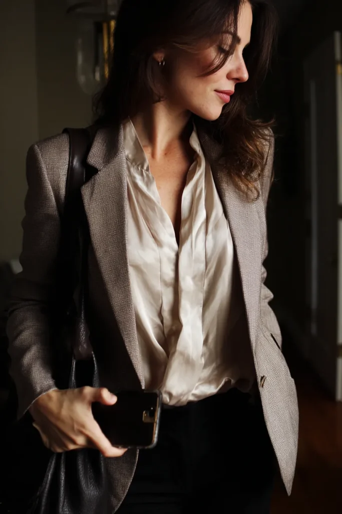 This outfit brings together a flowing satin ivory blouse with a textured taupe blazer that adds instant structure. The blouse has a soft sheen and a relaxed drape that feels luxurious without being flashy. The blazer sits neatly on top and gives the look a calm professional edge. Dark trousers ground the outfit and balance the lightness of the top. The mix of satin and woven fabric creates a refined pairing that feels polished and modern.