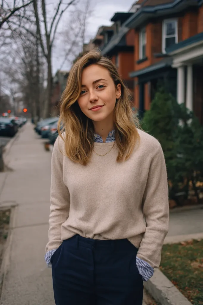 This outfit mixes a soft beige sweater with a classic blue and white striped button up peeking out at the collar and cuffs. The sweater has that cozy polished feel that works so well for cooler seasons and the crisp stripes underneath add a tailored touch without feeling too formal. Paired with dark navy trousers the whole look lands right in that business casual sweet spot. The colors stay neutral and calm which gives the outfit a clean timeless vibe.