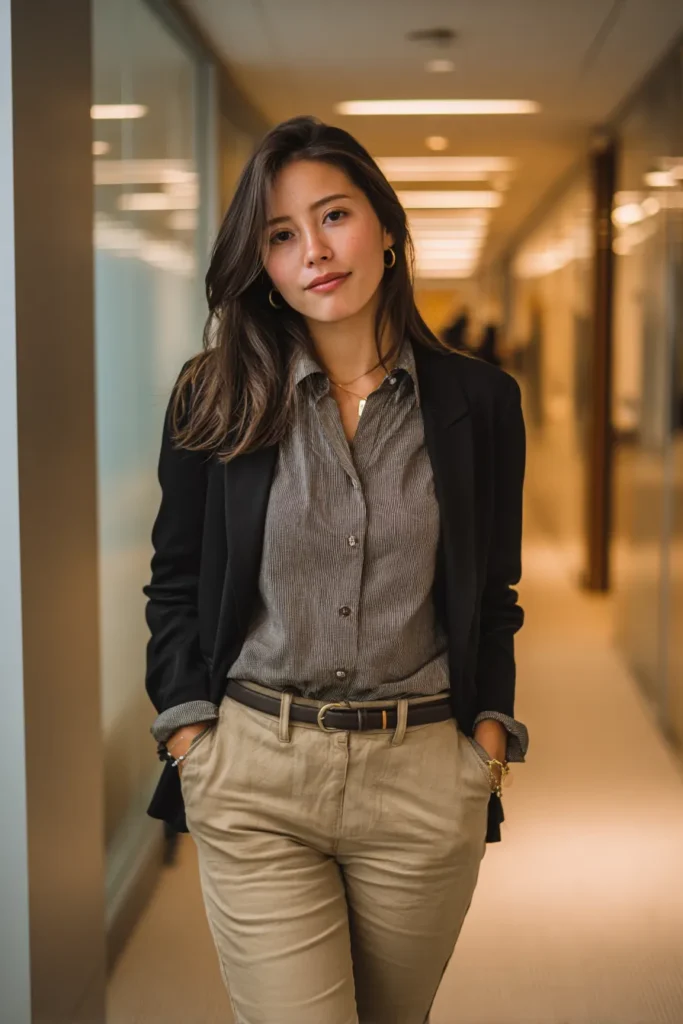 I love how wearable and confident this combination feels. The black blazer instantly sharpens the look while the striped shirt keeps it approachable. Khaki trousers give me that perfect middle ground between professional and relaxed which is exactly what I want on an interview day. The mix of tones feels balanced and intentional. It is the kind of outfit that lets me walk in with a calm steady energy while still looking completely put together.