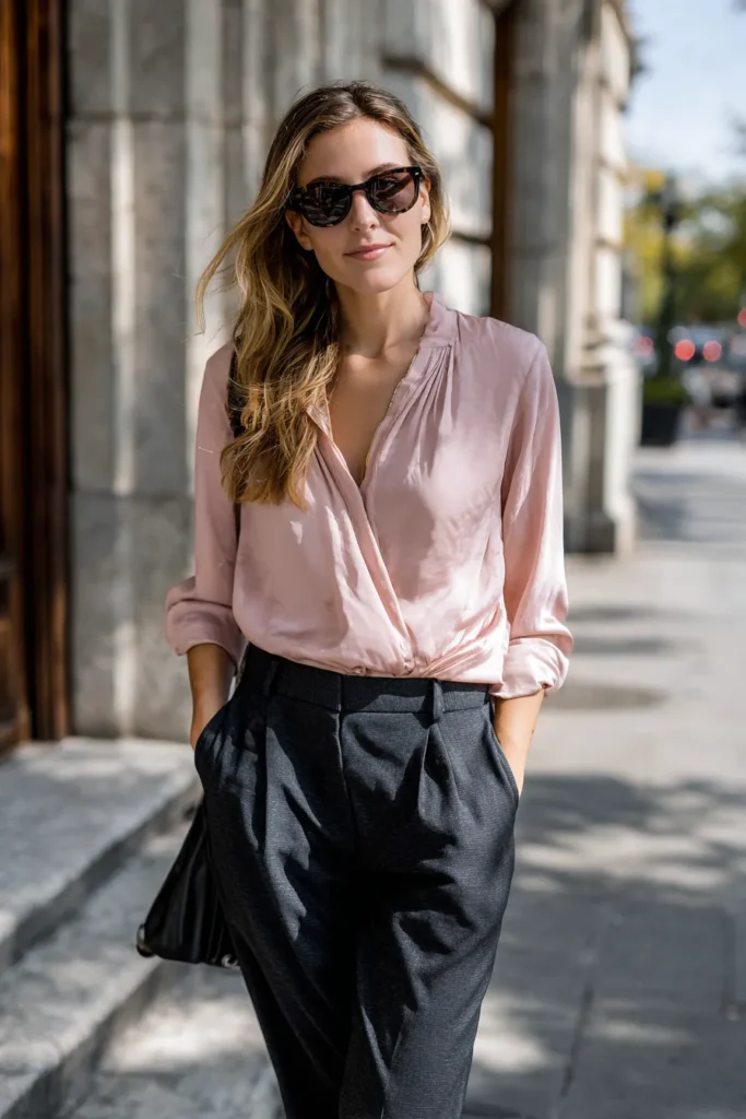 This outfit pairs a silky soft pink blouse with elegant charcoal trousers for a look that feels polished without trying too hard. The blouse has a relaxed drape with a subtle crossover shape that brings a hint of softness to the structured pleated trousers. The charcoal fabric adds balance and depth so the pink never feels overly sweet. With the sleeves casually rolled and the blouse tucked in just enough the whole look gives off that effortless confident vibe. Sunglasses and a simple black bag complete the outfit with a modern touch.