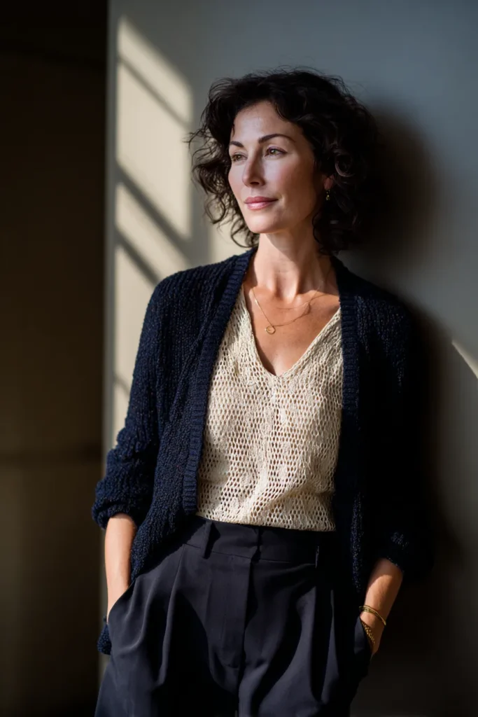 This outfit combines a deep navy cardigan with a textured cream top that brings in a soft woven look. The cardigan has a relaxed drape that feels cozy without looking too casual while the cream top adds a subtle pattern that keeps the outfit interesting. Paired with tailored navy trousers the whole look stays clean polished and quietly elegant. The colors blend beautifully and give the outfit a calm professional feel with a touch of warmth.