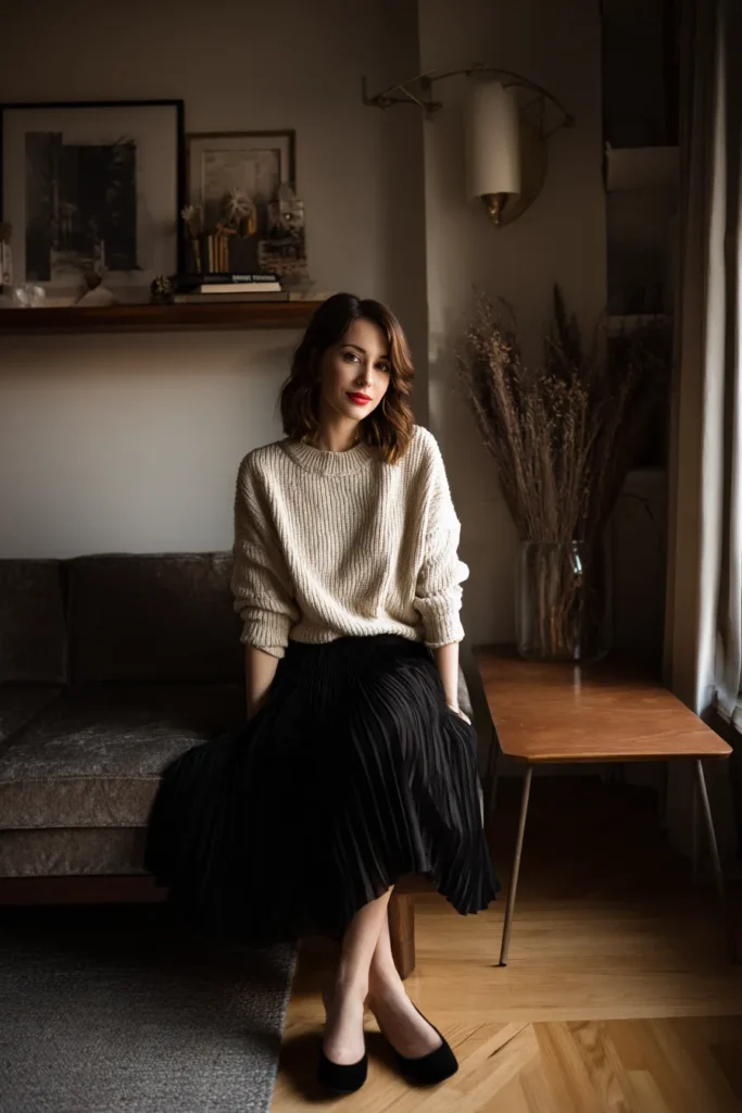 This outfit mixes a chunky cream sweater with a flowy black pleated midi skirt that moves beautifully. The sweater has a textured knit that feels soft and cozy while still looking polished. The pleated skirt adds a graceful shape and gives the look a refined feminine touch. Simple black flats keep everything grounded and create a clean silhouette. The contrast between the creamy knit and the structured black skirt gives the outfit a balanced and elegant feel.