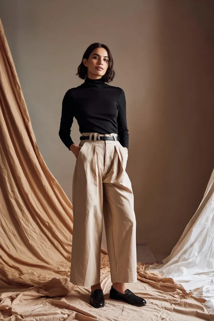 This outfit pairs a sleek black turtleneck with wide leg beige trousers that create a beautifully balanced silhouette. The turtleneck is fitted and smooth which adds a polished modern feel. The trousers bring in soft volume with their pleats and structured cotton fabric. A black belt ties the look together and simple black loafers keep everything grounded. The mix of fitted and relaxed pieces gives the outfit a clean confident vibe that feels perfect for an interview.