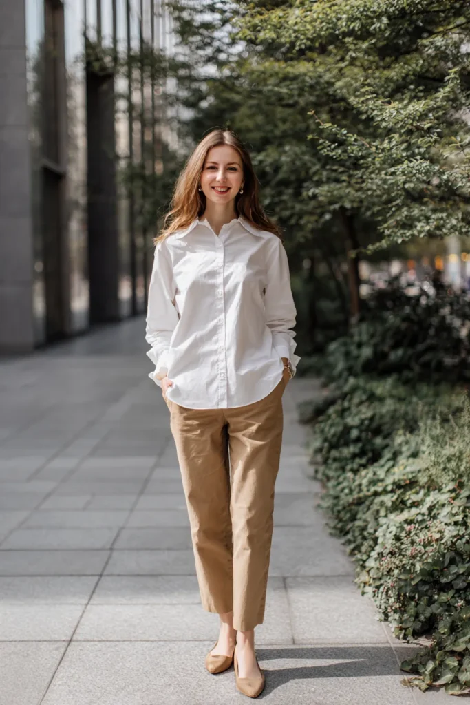 This outfit pairs a crisp white button up with tailored khaki trousers that create a clean bright and timeless look. The shirt has a relaxed fit with a slightly curved hem that keeps things soft and effortless. The khaki trousers add structure with their straight cut and subtle pleats. Neutral flats pull the whole outfit together and keep the silhouette simple and refined. The combination of white and khaki feels fresh polished and perfect for a warm weather interview day.
