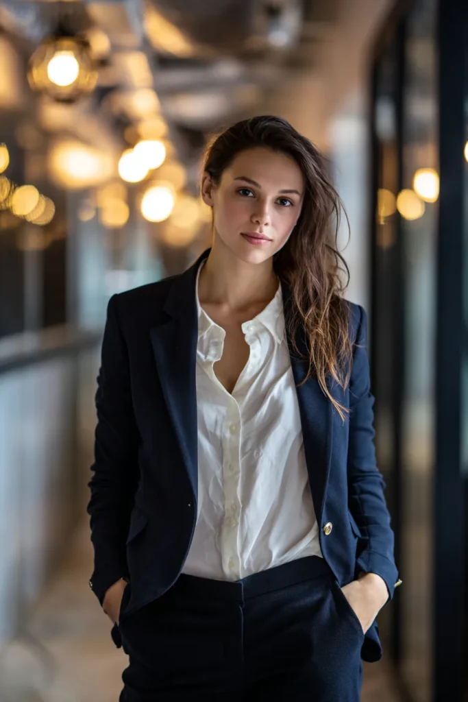 I love how this look feels powerful without feeling boxed in. The fitted blazer gives me great posture and a little extra confidence while the relaxed white shirt keeps the outfit approachable. It is the perfect mix of polished and comfortable which is exactly what I want when I am trying to make a strong first impression. The navy also has this way of making me look instantly put together even on days when I am running on sheer determination and good lighting.
