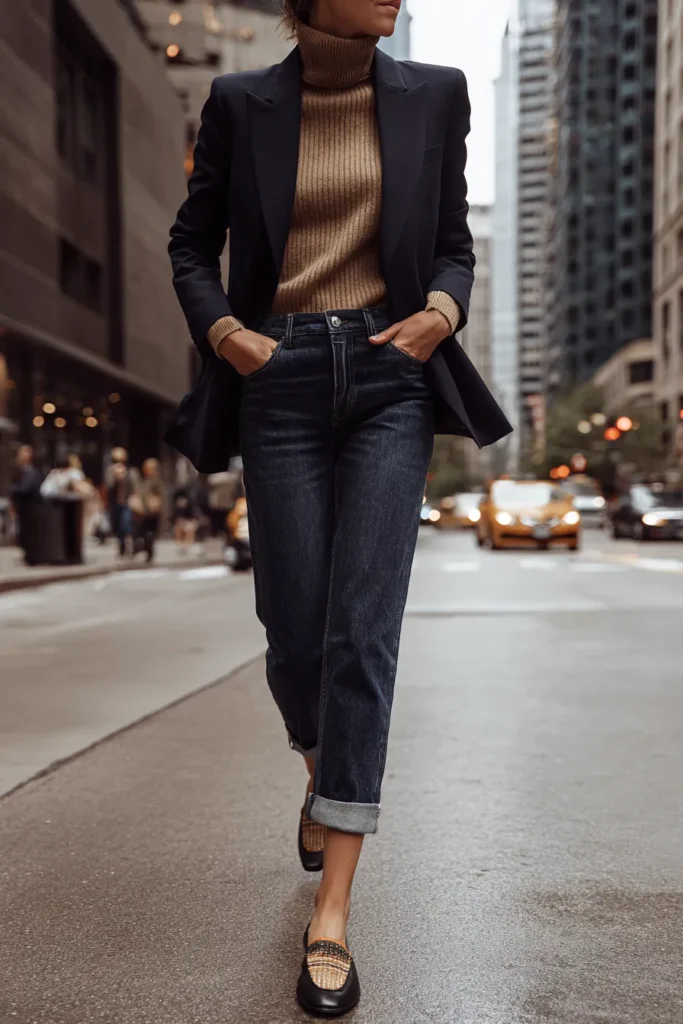 This outfit brings together a classic ribbed turtleneck in a warm camel shade with dark cuffed denim for a look that feels polished but relaxed. The tailored navy blazer adds a strong structured layer that sharpens everything instantly. The jeans have a clean straight leg fit that feels comfortable and modern. Textured loafers in a neutral pattern finish the look with a little personality while still keeping it office friendly. The overall vibe is smart stylish and perfect for cooler workdays.