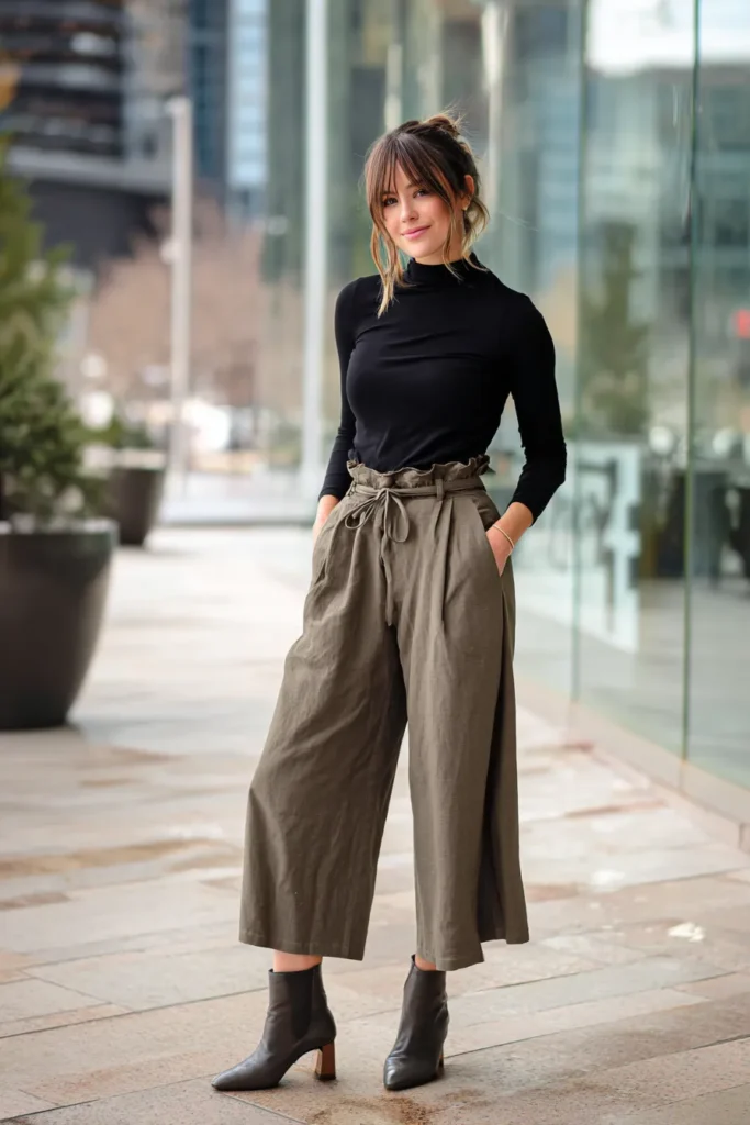 This outfit pairs a fitted black turtleneck with high waisted paperbag trousers in a soft olive tone. The top feels sleek and simple while the wide leg pants add movement and comfort. The tied waist creates a pretty gathered shape that feels flattering and modern. The cropped length of the pants shows off the heeled ankle boots which add a little height and polish. The whole look feels effortless with clean lines and a relaxed but put together vibe.