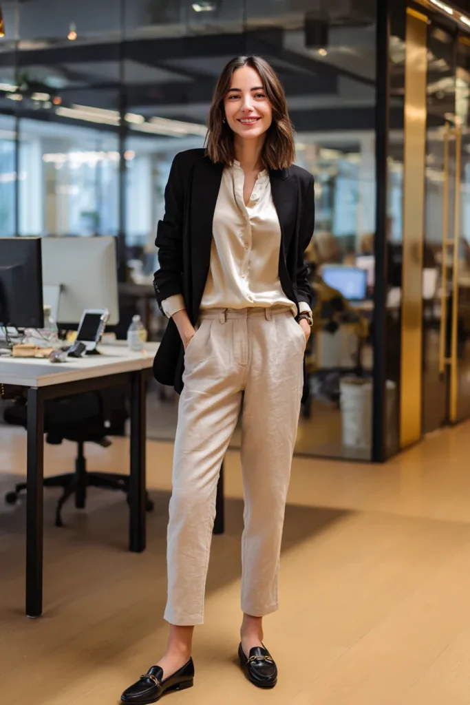This outfit blends soft neutrals with classic tailoring in the prettiest way. The silky cream blouse has a gentle sheen that feels elegant without looking fussy. The relaxed beige trousers add comfort and an easy drape that moves well through the day. The black blazer pulls everything together with a clean structure that instantly makes the whole outfit feel office ready. The black loafers keep things simple and practical while still giving the look a polished finish.