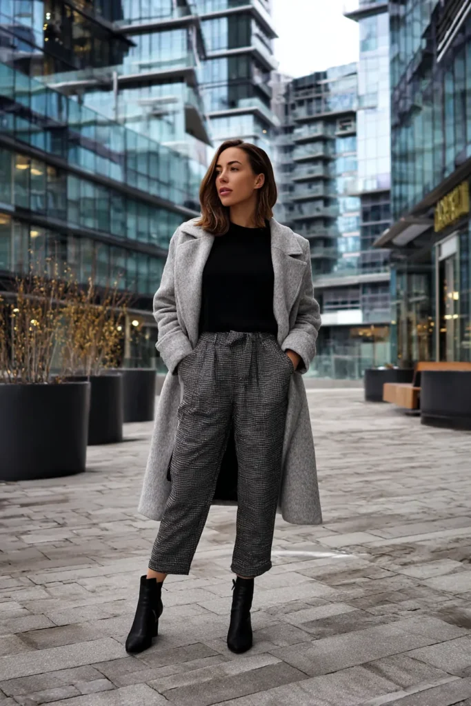 This look blends cozy layers with a clean city chic vibe. The long gray coat gives the outfit a soft structured feel and adds warmth without looking heavy. Underneath is a simple black top that keeps the base sleek and easy to style. The patterned trousers add interest with their subtle check design and relaxed tailored cut. Black ankle boots finish the look with a polished touch that works beautifully for cooler workdays.