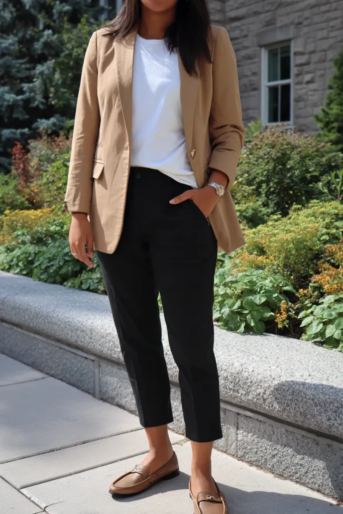 This outfit keeps things simple in the best way with a crisp white tee paired with tailored black ankle pants. The tan blazer adds structure and warmth to the look while still feeling relaxed thanks to the soft fabric and effortless fit. Neutral loafers tie everything together with a polished but comfortable finish. The overall vibe feels clean and breathable which makes it perfect for busy days when you still want to look put together.