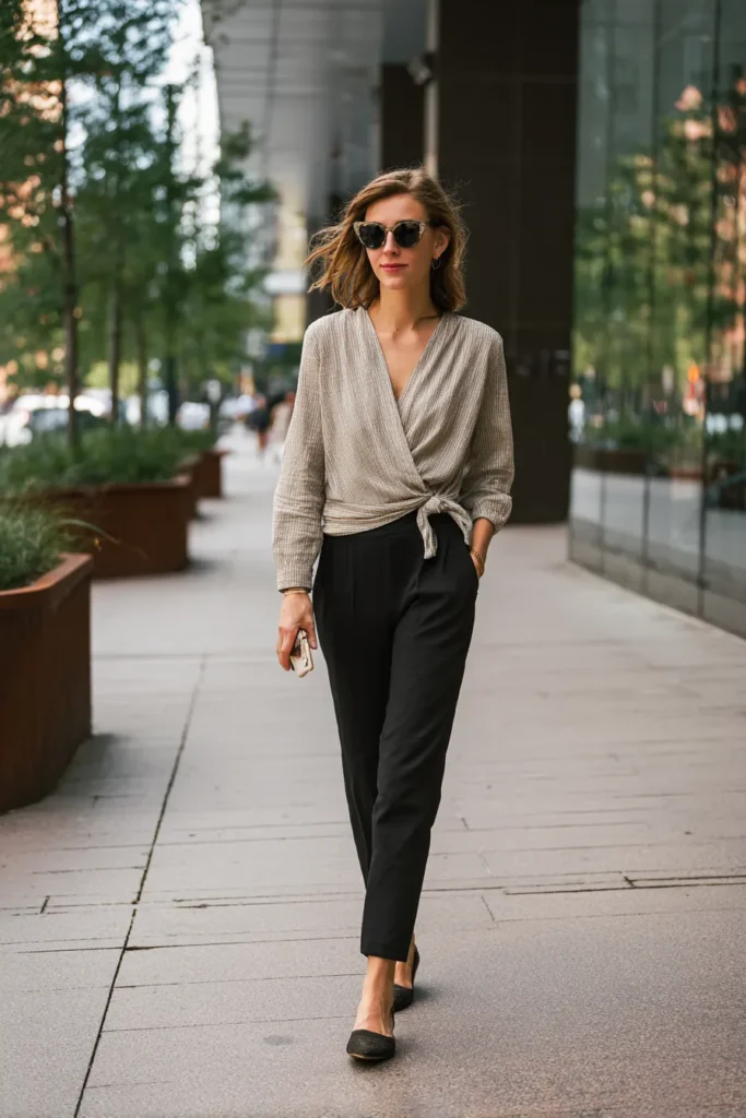 This outfit mixes softness and structure with a light textured wrap top paired with sleek black trousers. The wrap top creates a flattering shape with its gentle drape and side tie which adds a feminine touch without feeling fussy. The trousers keep things polished with their slim tailored fit. Black flats finish the look with an easy and comfortable step that still feels refined. The whole vibe is relaxed but stylish which makes it perfect for warmer days in the office.