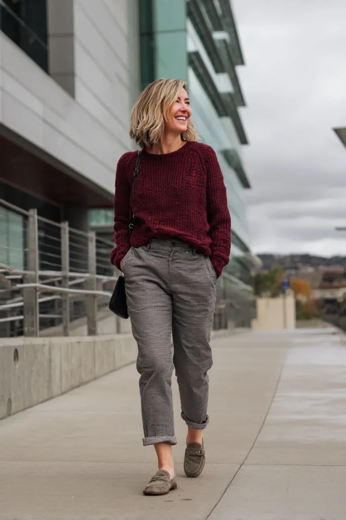 I love how this outfit mixes structure and softness in such a natural way. The burgundy sweater brings so much warmth to the look and it gives a nice pop of color without feeling bold. The check trousers feel flattering and relaxed which is something I appreciate on days when I want comfort with a little style. I also like how the loafers keep the outfit grounded and easy to move in. This is one of those outfits that makes me feel cozy confident and ready for anything the day throws at me.