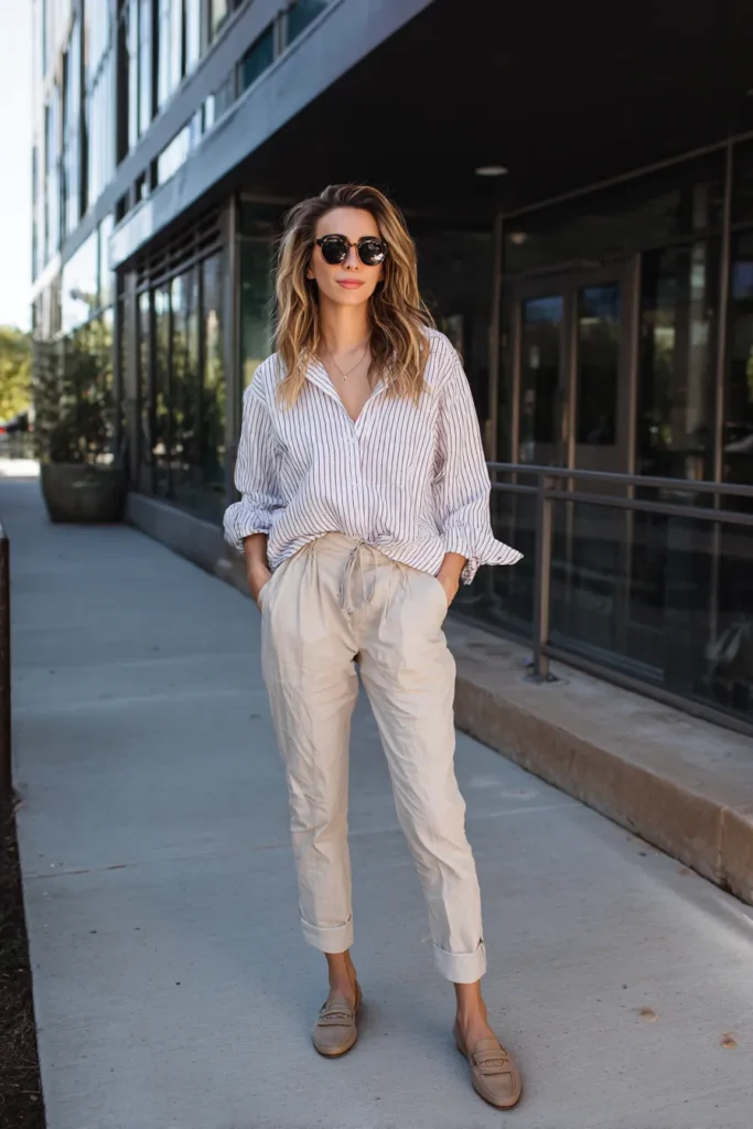 This outfit keeps things breezy with a relaxed striped button up tucked loosely into light tapered pants. The shirt has an easy drape that feels effortless and the rolled sleeves add a laid back touch that still looks intentional. The pants have a soft fabric and drawstring waist that gives the outfit a comfortable fit while still looking polished. Neutral loafers finish the look with a clean and simple style that ties the whole palette together.