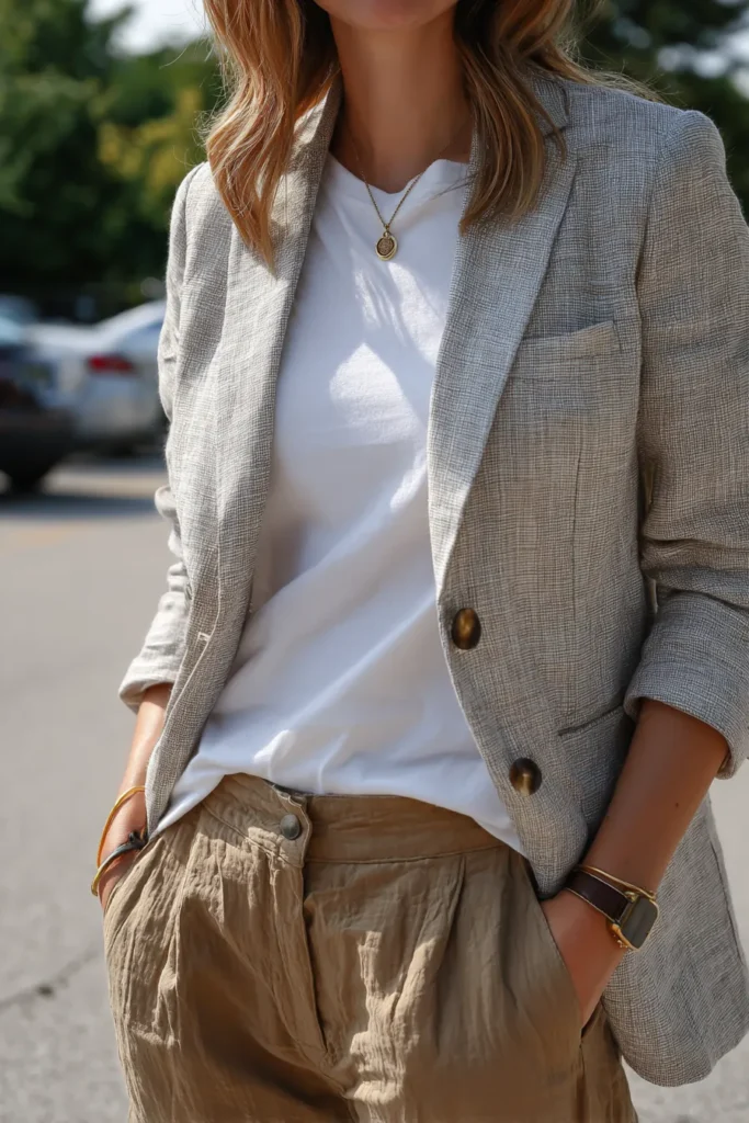 This outfit has such an easy warm weather feel with its soft linen blazer paired over a classic white tee. The blazer has a subtle textured pattern that adds depth while still keeping the look light and breathable. The relaxed khaki trousers give the outfit a comfortable shape with their slightly crinkled fabric and loose fit. Simple gold jewelry and a dark leather watch create a clean polished contrast without overpowering the look.