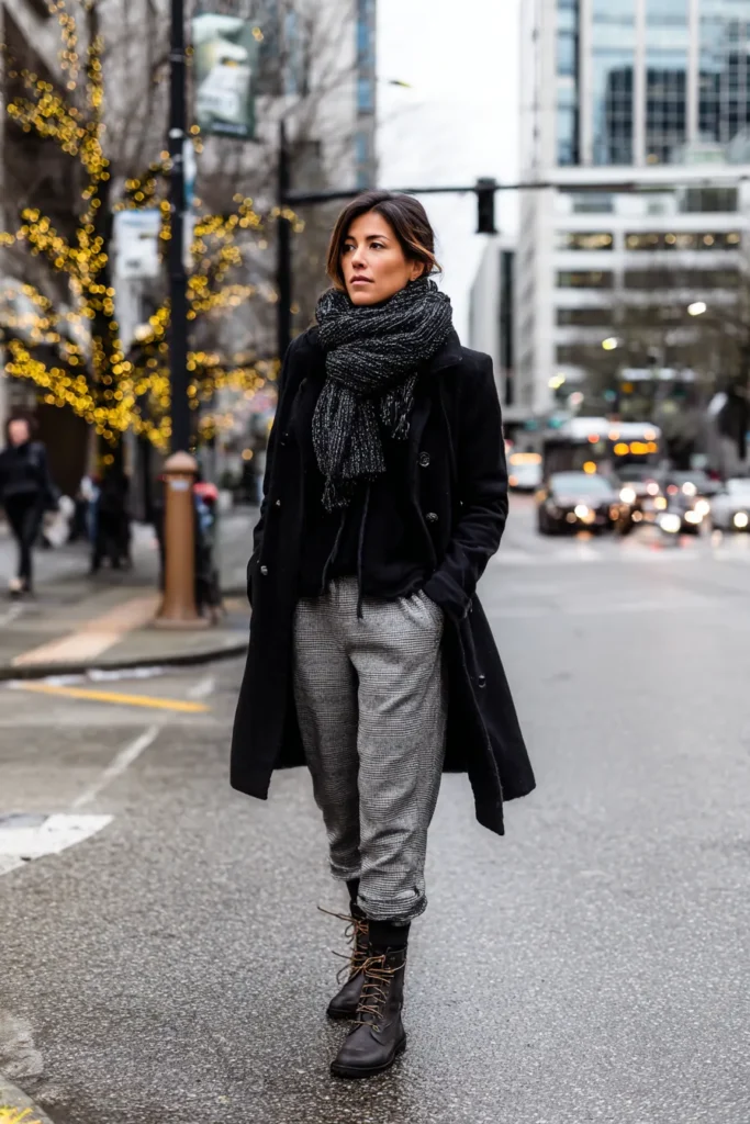 This outfit layers a long black coat over a soft black top and adds a chunky gray scarf for extra warmth and texture. The coat has a clean tailored shape that gives the outfit structure while the scarf brings a cozy relaxed feel. The trousers add subtle pattern and a slightly tapered fit that keeps the look polished. Lace up boots finish everything with a practical but stylish edge that works beautifully for cold city days.