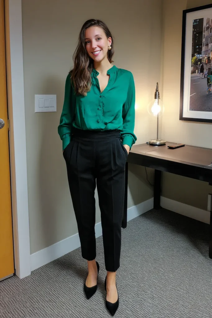 This outfit pairs a rich emerald blouse with sleek black tailored trousers for a polished and elegant look. The blouse has a soft drape with delicate buttons and a relaxed neckline that feels feminine without being too formal. The trousers add structure with their clean pleats and tapered fit which helps balance the flowy top. Classic black pointed flats complete the outfit with a simple refined touch. The overall vibe feels chic office ready and flattering from every angle.