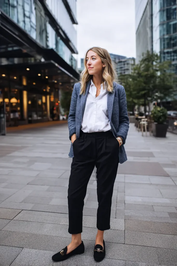 This outfit brings together a crisp white button up with sleek black trousers and a textured blue blazer. The button up keeps the look fresh and polished while the blazer adds structure with its soft tailored shape. The trousers taper gently at the ankle which creates a clean modern line that pairs well with the simple loafers. The overall vibe feels timeless and easy in that perfect business casual way.