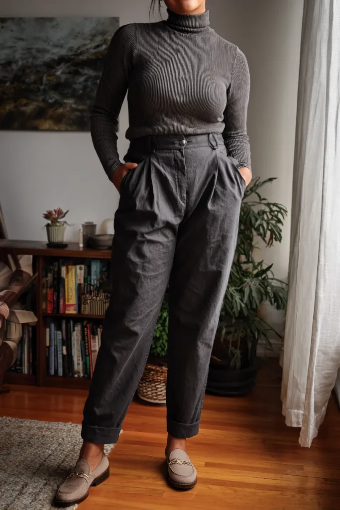 This outfit stays effortlessly cohesive with a ribbed gray turtleneck tucked into structured pleated trousers in a slightly deeper gray. The fitted top creates a clean streamlined shape while the trousers add volume with their tailored pleats and cuffed hems. The soft earthy loafers bring a touch of warmth to the look and keep everything grounded. The overall vibe feels minimal polished and comfortable in the best way.
