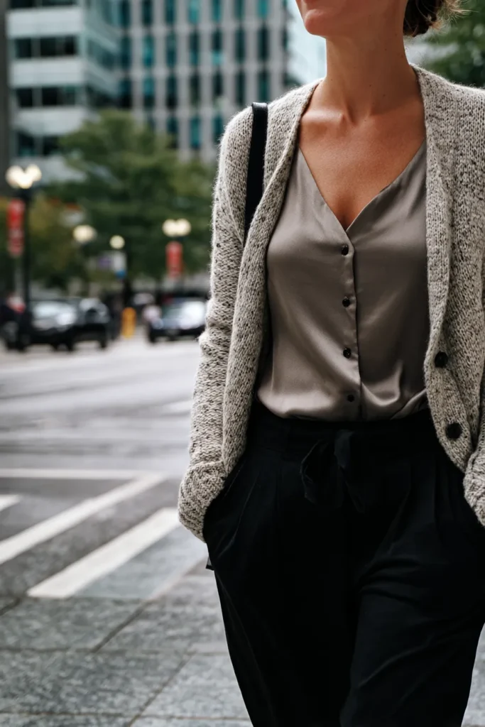 This outfit blends cozy textures with a polished touch by pairing a chunky knit cardigan over a silky satin button up. The top has a soft sheen that feels elegant and the cardigan adds warmth without taking away from the outfit’s refined vibe. The black trousers tie at the waist and have a relaxed drape that keeps everything comfortable and chic. The color palette stays neutral and calming which makes the whole look feel effortless and office friendly.