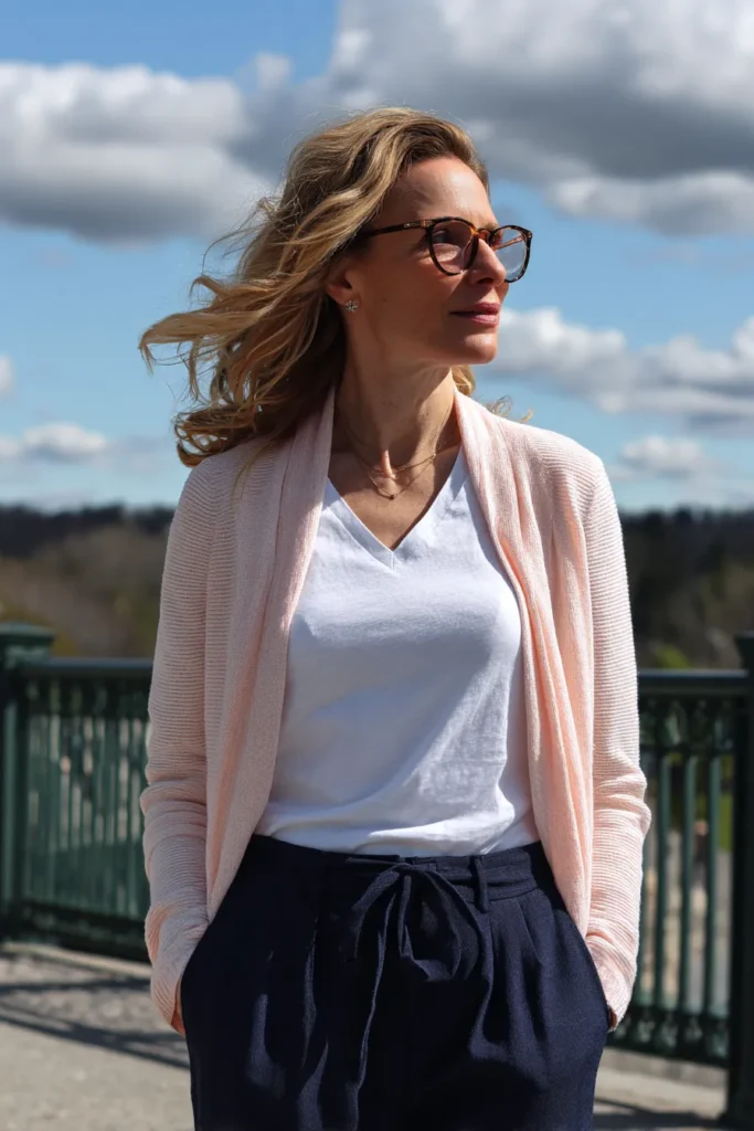 This outfit feels fresh and airy with a soft blush cardigan layered over a classic white V neck tee. The cardigan has a light knit texture that adds just enough warmth without feeling heavy. The navy trousers balance the lighter top half with their tailored shape and tie waist that gives the outfit a polished finish. The soft color palette makes the whole look feel relaxed and easy which works beautifully for mild weather workdays.