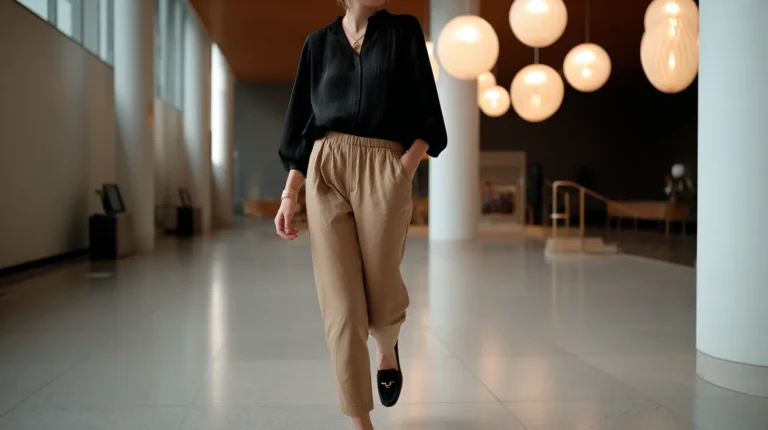I love how harmonious this outfit feels thanks to the simple color pairing. The black top brings a little depth and sophistication while the camel trousers brighten everything and feel very friendly on a midsize frame. The pleated waist offers definition without feeling restrictive and the loafers give just the right amount of polish for a workday. This is one of those looks that makes me feel stylish without needing any extra effort which is always a win in my book.