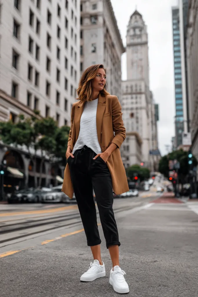 This ensemble showcases a perfect blend of modern comfort and professional polish making it an ideal Casual Friday choice. The base layers are easy and relaxed featuring a slightly oversized white t-shirt and a pair of chic black tapered trousers cuffed above the ankle. The outfit is instantly elevated and given that business casual edge by a gorgeous longline blazer in a rich camel or burnt caramel color. Finally, the look is grounded with a pair of crisp clean white sneakers proving that comfy footwear can absolutely belong in the office.