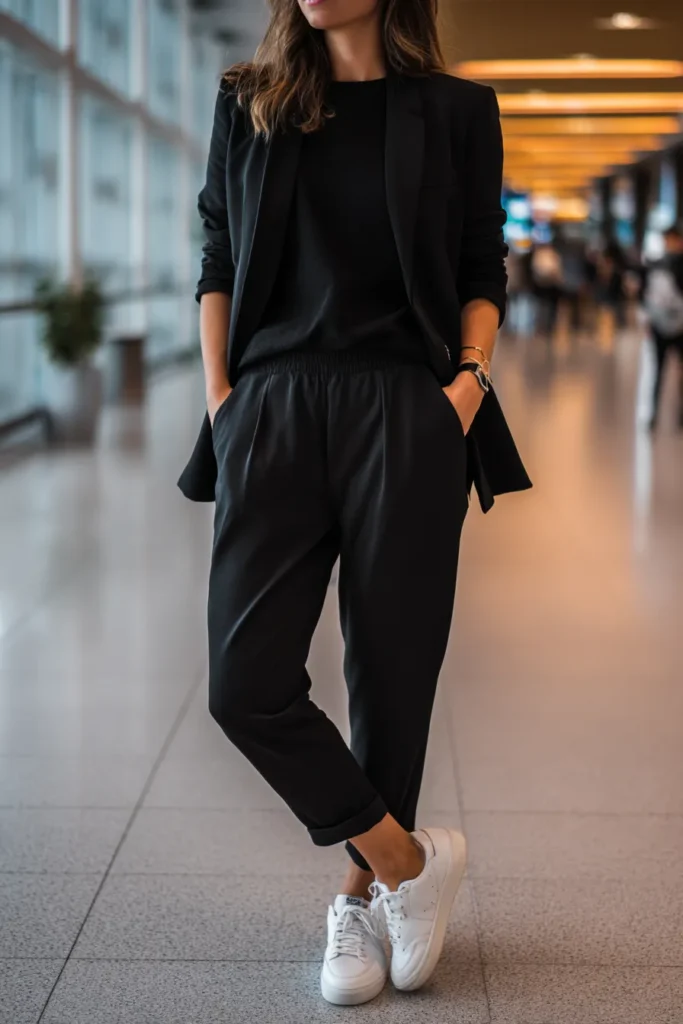 This travel outfit is pure sleek sophistication proving that head-to-toe black can be anything but boring. The core of the look is a monochromatic base featuring a simple black crewneck top or lightweight sweater and black ankle-length trousers with a comfy elastic waist. These trousers look like they are made from a wrinkle-resistant flowing fabric ideal for long journeys. Layered over the top is a tailored black blazer or jacket with the sleeves casually pushed up adding a relaxed touch. The whole dark ensemble is given a fresh pop of contrast and a sporty edge with a pair of crisp white fashion sneakers.