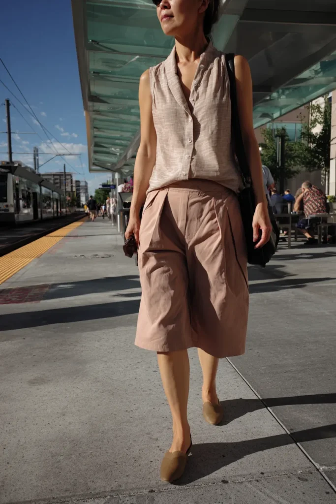 This is an absolutely perfect warm-weather business casual outfit embracing light fabrics and a relaxed silhouette. It’s all about soft neutrals with a sleeveless button-down collared blouse in a light beige or cream with a subtle textured stripe. This is neatly tucked into a pair of high-waisted pleated culottes or knee-length wide-leg shorts in a lovely muted rosy beige or dusty pink color. The look is grounded with comfortable pointed or scalloped taupe suede slip-on mules maintaining that chic yet casual vibe for a summery Friday.