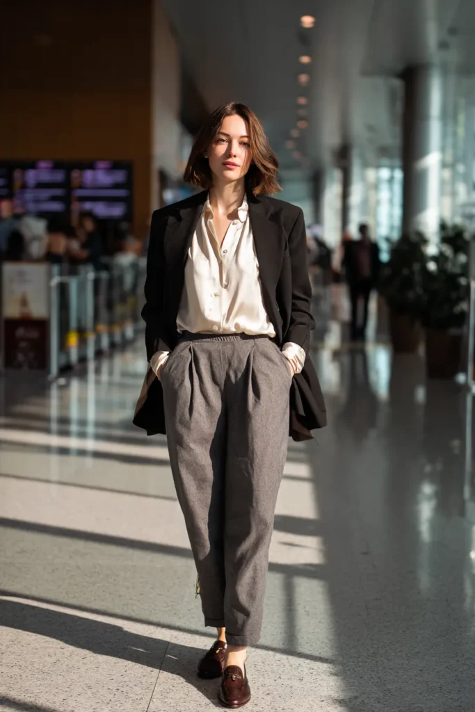 This look is a masterclass in effortlessly chic business travel attire with a focus on relaxed tailoring. She’s wearing a classic black oversized blazer which instantly adds an air of professionalism and structure. Underneath the blazer is a soft creamy or champagne silk button-down blouse that is lightly tucked into the trousers. The genius lies in those gray pleated wide-leg trousers which appear to be made of a comfortable woolen or soft blended fabric and likely have a wonderfully forgiving elastic waistband. A pair of polished dark brown leather loafers with a gold buckle completes this stylish and comfortable travel ensemble.