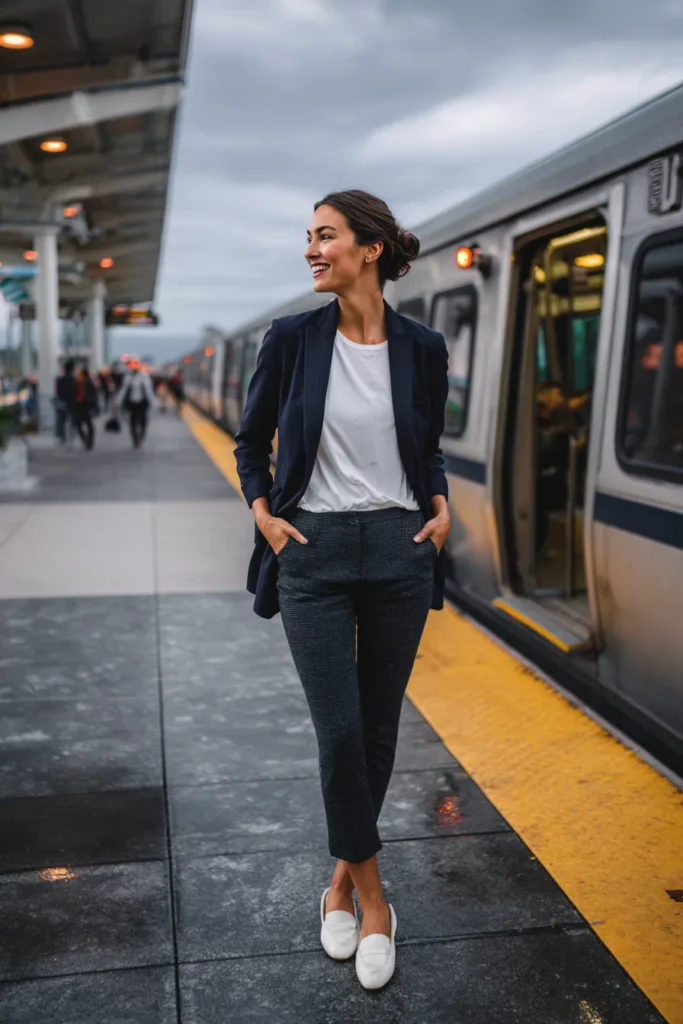 I love this outfit because it perfectly balances business professionalism with travel-friendly comfort. Some people love wearing blazers for travel because it keeps you looking sharp but that bright white top and those sleek white loafers make the whole look feel fresh and not too stuffy. The fit of those trousers is extremely flattering they hug the curves nicely without looking restrictive and the slight crop shows off the slimmest part of the leg. This outfit is perfect proof that navy and gray is a fantastic classic color combo and that you don’t need a dress shirt to look totally put-together.